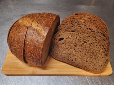 A traditional Pumpernickel Dark Rye sourdough using a mix of whole berry rye flour, wheat flour, rye meal and dark malt flour. Has a sweetish taste which is off set by the acidity of the sourdough giving a pleasant earthy flavour. Also available as a loaf.